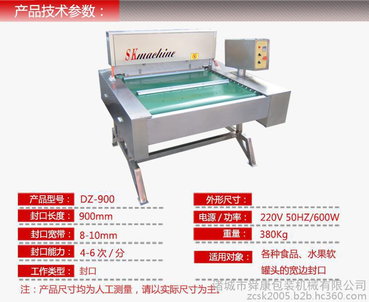 ZFK-900滚动式封口机采用国际标准食品专用304不锈钢制作,强高不易破损;真空包装机传送带采用了进口专用特殊材料,高强度,重量轻,耐腐蚀,抗磨损。加热元件全部安装在工作室内,可避免受包装物品(特别是液体)的影响而造成的短路等故障,并设计了水冷保护人性化系统,工作台面角度可调,操作方便,效率高. ?适用范围: 大小包装物、酱菜、肉类、熟食品豆制品、蔬菜调味品、冷冻品、药品化工、海产品加工等行业, ?设备特点: 该设备**大封口线可达900mm,可满足高产量要求。该机具有精度高、升降平稳、滚动皮带走带定位准确的显著特点;设备操作人员无须手动调整传送带位置,更省时省力。