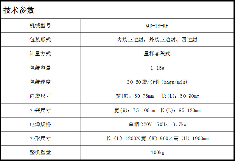 | 计量方式 | 颗粒量杯容积式,粉末卧式螺杆 |