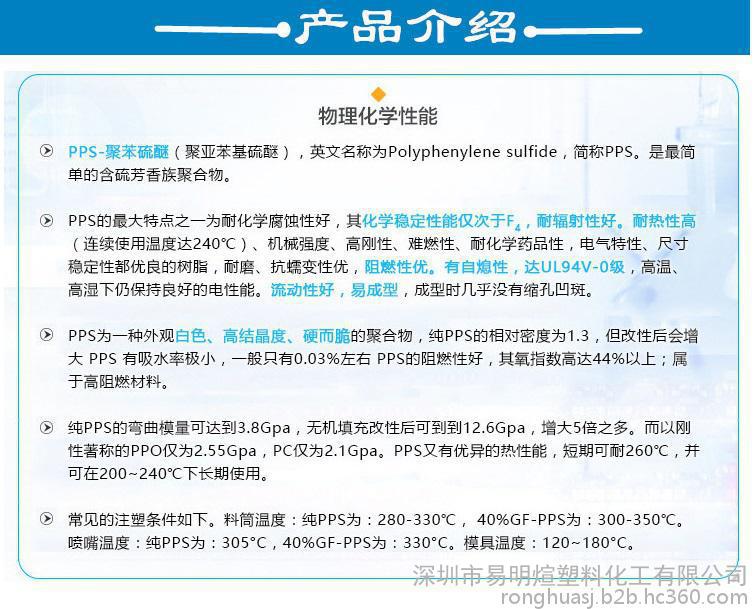 PPS的突出性能有;良好的耐热性能,热变形温度一般大于260度,可在180~220℃温度范围使用,PPS是工程塑料中耐热性好的品种之一;