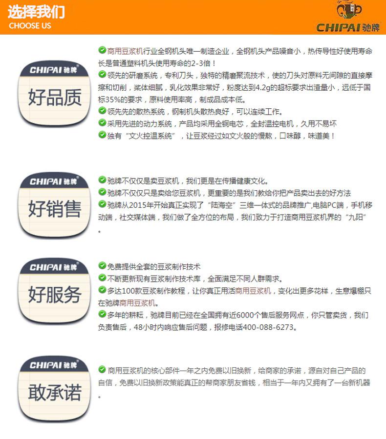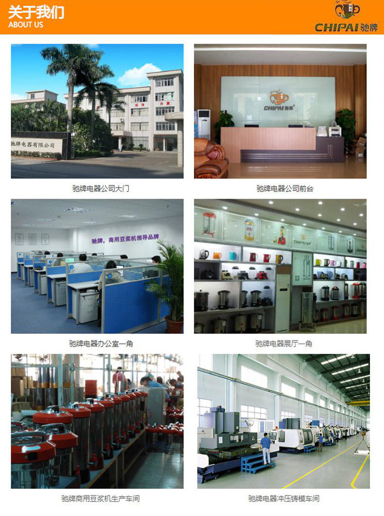 坚持创新、专业、专注是驰牌电器成功的法宝,2014年驰牌在众多的豆浆机品牌中脱颖而出,获得中国商用厨具行业品牌盛会“商用豆浆机自主创新奖”。驰牌电器拥有一支高水平的研发团队和营销团队,致力通过稳健的发展模式来整合公司本身的资源优势,完善和规范公司的制度和文化,为广大经销商朋友市场拓展出谋划策,共创辉煌。了解更多请登录公司网址:www.cp1980.com.