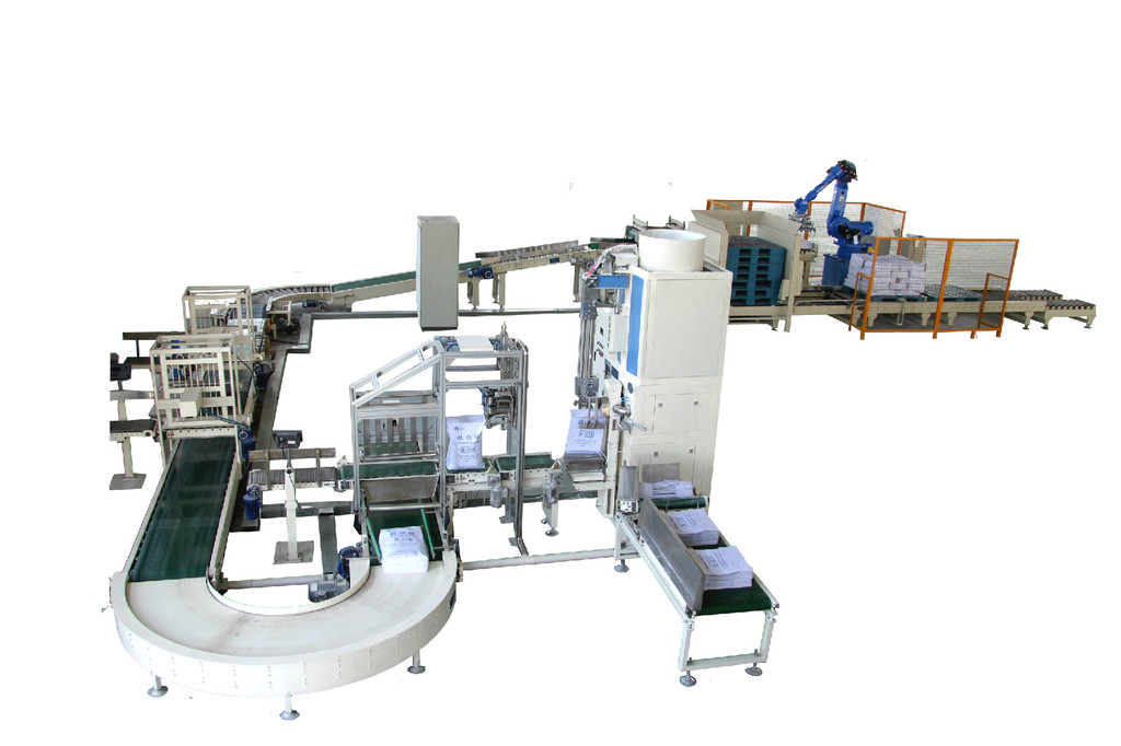 该系列产品由自动上袋系统、定量自动包装机、封口装置、输送机、倒包机构、重量复检机、剔除机、整形机、喷码机、码垛机器人、托盘库、满垛整形机等设备组成,可以完成粘性粉体、超轻细粉体及普通物料的全自动定量包装码垛生产。该生产线可进行纸塑复合包装袋、全纸包装袋、全塑包装袋等不同材质的阀口、敞口包装袋包装生产。服务的行业涵盖了食品、化工、建材、颜料、矿产等定量包装、自动码垛领域,经**质监部门检测,该生产线包装精度高、无粉尘污染、自动化程度高。