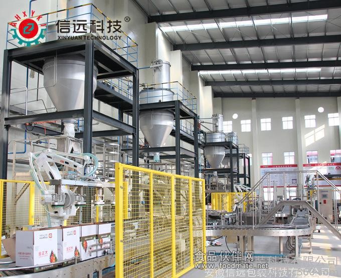 原料包输送―→向各原料仓口投料―→按配方电脑配料(电子称重)―→自动卸料―→自动提升―→自动混合均匀―→自动卸料至定量包装机料仓(料位自动控制)--→自动称重计量―→自动充填―→输送―→内袋热封口―→外袋缝包