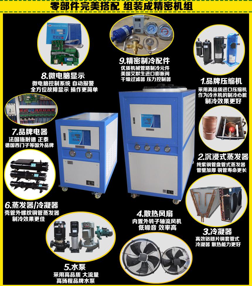 冷水机电动功率分为:0.37KW、0.75KW、1.5KW、2.2KW、3.75KW、4KW…可根据用户要求做到45KW。