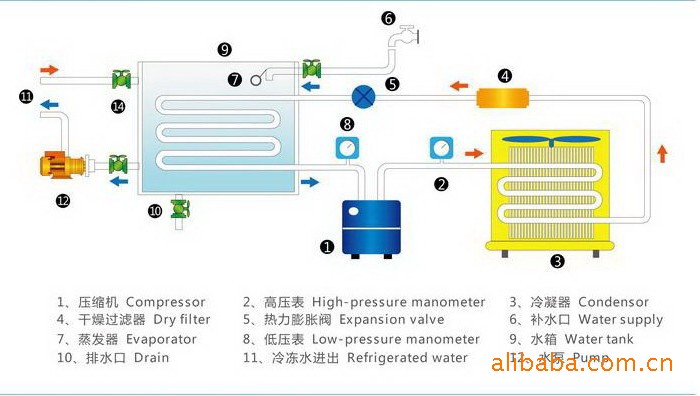 | 工业冷冻机详细介绍: 冠信--冷水机组采用先进的微电脑智能化控制系统,精确控制工业生产过程所需的各种温度(5℃~35℃)。不仅调控温度全面实现人机界面功能且保证机组控温精度高达±1℃。对于其他温度范围可按要求定制。 1、制冷压缩机及其它制冷配件和控制元器件均采用国际国内知名品牌,不仅保证机组性能的充分发挥,同时确保机组具有较长的使用寿命。 2、冷水机组具备完善的保护装置(高压、低压、过压、欠压、过载、缺相、时间延时、缺水保护等)及联锁控制线路,且主要故障均在面板上显示,检修简易。 3、节流方式均采用外平衡热力膨胀阀控制, 温度调节范围广,制冷剂流量自动控制,机组运行十分稳定,能效比最优,与目前市场上普遍采用的毛细管节流相比,具有无可比拟的优越性。当工况如环境温度、要求的水温、热负荷等变化时,毛细管无法自我调节,此时制冷量下降,同时可能会造成压缩机排气温度过高、润滑性下降或液击,直接影响机组的使用寿命,严重时制冷系统无法正常工作。 4、冷凝器采用蜂窝铝翅片串高效内螺纹紫铜管配合高效轴流风机,换热效果非常好。 5、蒸发器备有多种形式供客户选用(不锈钢水箱盘管式、不锈钢板式、干式壳管式、电镀耐酸蒸发器)。 6、选用不锈钢优质水泵,干燥过滤器等部件匀采用美国艾默森品牌,可靠耐用。 7、按需内置或外置补给贮水箱,避免启停频繁,自动或手动补充水。 有适合各种机械设备配套之机型,可按客户要求特别制造。 特殊配电要求可定制。我们为您定制的冷水机价格肯定不是最低,性能也可能不是最好,但一定是最适合您的! 冠信风冷式冷水机原理图: | 型号 model | GXA | GXA-02 | GXA-03 | GXA-05 | GXA-08 | GXA-10 | GXA-12 | GXA-15 | GXA-20 | GXA-25 | GXA-30 | GXA-40 | GXA-50 | | 压缩机功率power | KW | 1.82 | 2.68 | 4.43 | 7.00 | 9.06 | 10.94 | 13.88 | 19.02 | 23.91 | 27.56 | 38.04 | 47.82 | | HP | 2 | 3 | 5 | 8 | 10 | 12 | 15 | 20 | 25 | 15x2 | 20x2 | 25x2 | | 制冷量 large | Kcal/h | 6000 | 9000 | 12600 | 20800 | 28300 | 31600 | 37500 | 55300 | 66500 | 75000 | 110600 | 133000 | | KW | 6.59 | 11.05 | 16.98 | 24.20 | 32.91 | 36.74 | 43.60 | 64.30 | 77.33 | 87.21 | 128.60 | 154.65 | | 制冷剂 refrigerants | 氟利昂 R22 | | 电源power | 3相380V50Hz | | 运行电流 Operating current | A | 4.9 | 8.0 | 11.4 | 16 | 20 | 25 | 30 | 40 | 50 | 60 | 80 | 100 | | 冻水泵功率pump power | KW | 0.55 | 0.55 | 0.75 | 1.1 | 1.5 | 2.2 | 3.0 | 3.0 | 3.0 | 3.0 | 4.0 | 4.0 | | 冻水流量 Cooling water flow | T/h | 2 | 3 | 4 | 6 | 8 | 10 | 12 | 15 | 20 | 20 | 25 | 25 | | 冻水管径 Cooling water pipe diameter | Inch | 1 | 1-1/2 | 2 | 2-1/2 | | 风扇功率 Fan power | KW | 0.19 | 0.30 | 0.38 | 0.55 | 0.96 | 0.96 | 1.10 | 1.35 | 1.35 | 1.65 | 1.65 | | | 外形尺寸 Envelop dimensions | 长 L | MM | 800 | 1050 | 1200 | 1300 | 1450 | 1650 | 1950 | 2400 | 2600 | 2900 | 3250 | 3200 | | 宽 W | MM | 660 | 620 | 660 | 860 | 920 | 920 | 920 | 1100 | 1120 | 1120 | 1120 | 1200 | | 高 H | MM | 1300 | 1300 | 1300 | 1300 | 1760 | 1800 | 1860 | 2000 | 2000 | 2000 | 2000 | 2400 | | 重量 Weight | | 120 | 160 | 200 | 320 | 450 | 660 | 750 | 900 | 1100 | 1300 | 1500 | 1800 | 冠信售后服务 冠信公司拥有专业的制冷技术人员和先进的生产设备,生产过程中严格执行产品质量要求,建立了一套完整的质量管理体系,保证产品质量。我们始终坚持“质量第一,顾客至上”原则,为客户提供优质的制冷设备。 我们承诺:所有产品一年保修 终身维护 欢迎各位新老客户的惠顾垂询。我们将竭诚为您服务! |
