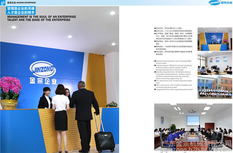 金宗企业创立于1999年,业务涉及机械设备设计及制造、智能控制系统研发、工程设计安装、汽车用品、化妆品、新能源产品等领域;旗下广州金宗机械公司位于广州番禺天安科技园,广东金宗机械有限公司位于肇庆(大旺**高新区。