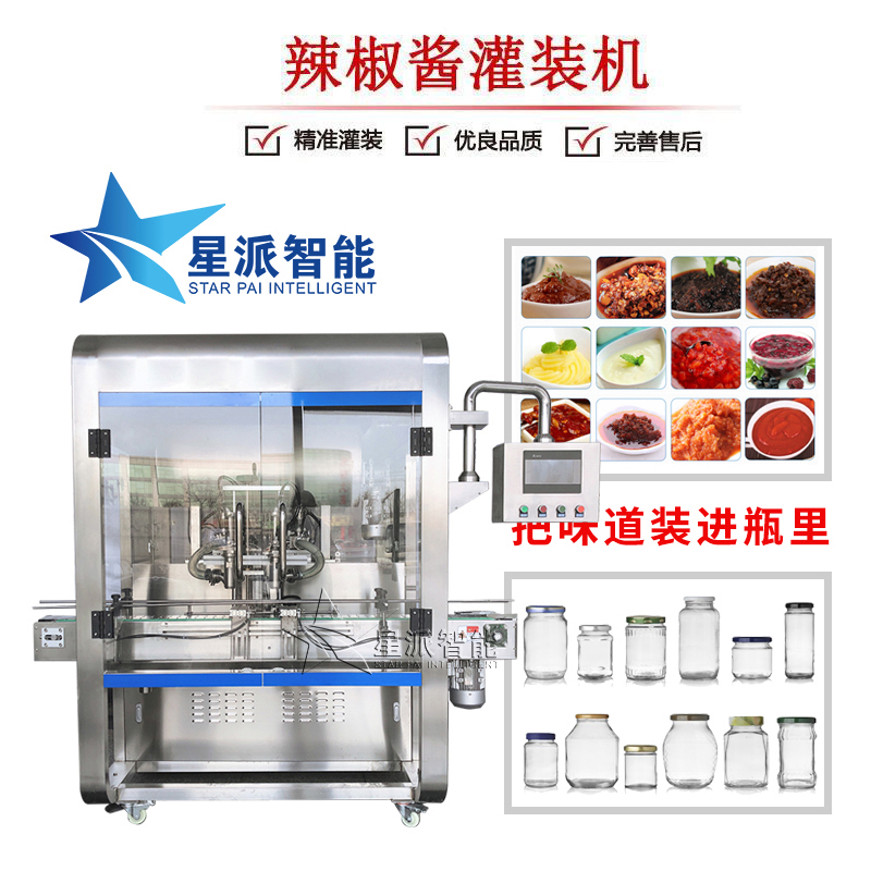 灌装机采用活塞式灌装原理,适用于调味品中带颗粒并且浓度较大的辣椒酱、豆瓣酱、花生酱、香菇酱、果酱、牛油火锅底料、红油火锅底料、虾酱等较为粘稠酱类的灌装。