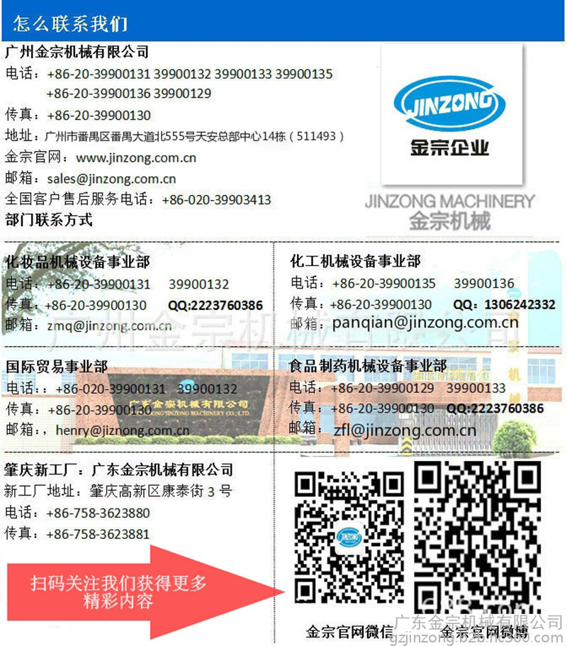 金宗机械JGA型膏体灌装机适合中低粘度的膏体物料的计量灌装。性能可靠、清洗容易、操作方便,符合GMP标准,为日化行业大量采用。