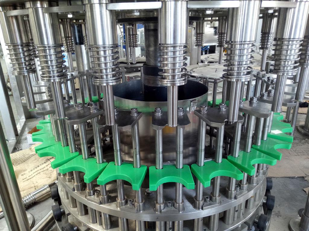 瓶子由瓶子风送系统通过拨瓶星轮传送至三合一灌装机。冲瓶机回转盘上装有瓶夹,瓶夹夹住瓶口沿一导轨翻转180°,使瓶口向下。在冲瓶机特定区域,喷嘴喷出冲瓶消毒液或水,对瓶子内壁进行冲洗。瓶子经冲洗、沥干后在瓶夹夹持下沿导轨再翻转180°,使瓶口向上。洗净后的瓶子通过拨瓶星轮由冲瓶机导出并传送至灌装机。进入灌装机的瓶子由瓶颈托板卡住瓶口保持。灌装阀通过阀升降机构在凸轮作用下实现下降与上升。灌装采用压力灌装方式。灌装阀下降接触瓶口后打开完成灌装过程,灌装结束后灌装阀上升离开瓶口,瓶子通过卡瓶颈过渡拨轮进入旋盖机。旋盖机上的止旋刀卡住瓶颈部位,保持瓶子直立并防止旋转。旋盖头在旋盖机上保持公转并自转,在凸轮作用下实现抓盖、套盖、旋盖、脱盖动作,完成整个封盖过程。成品瓶通过出瓶拨轮从旋盖机传送到出瓶输送链上,由输送链传送出三合一瓶装机。整机设备采用封窗封闭,封窗高度高于设备最高点,进、出瓶处留有适当的通道,封窗底部留有排风槽。