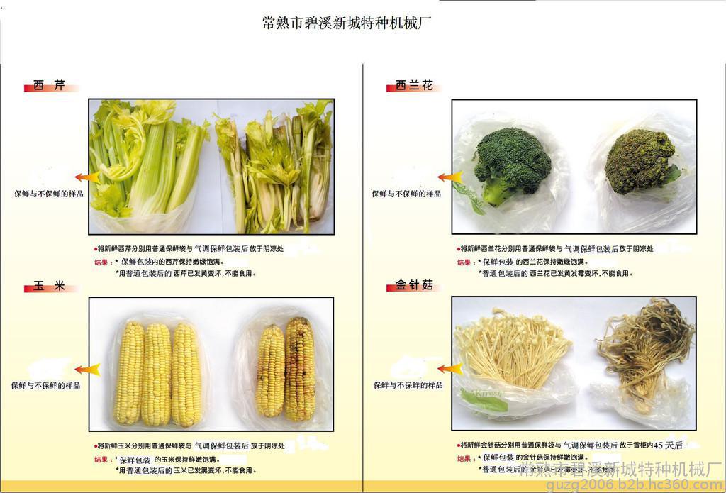 本公司主要从事生产各种蔬菜水果的气调保鲜机,该机器配备了松下FLC控制,使用了韩国内制真空泵,真空过虑器,气体的置换率为》99.7%,与国内同类机器相比它使用可靠稳定,延长了机器的使用寿命,并且该机器适合各种可封口的包装袋,刹见封口包装温度可调节,它的真空可调节在0.1秒的时间,这样**不会使产品损坏变形,该机适合各种蔬菜保鲜的包装袋子.能对产品起到更好的保鲜效果. 适用..食品中的海鲜、水果、茶叶、盐渍物品、豆制品.干果炒货等的真空包装,以防止氧化变质、虫蛀、受潮,延长保质期。或充入氮气、二氧化碳等保护气,以保鲜保味,延长产品的存储期,并可以防冲击。 集封口、真空及充气等多种功能于一体。 - 气缸驱动运转高度耐久(需空压机) 外观 整洁干净为304不锈钢材料.