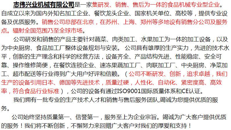 台湾志伟机械从事切菜机、洗菜机、切肉机、锯骨机、真空包装机、搅拌机 、滚揉机、脱水机 等 研发生产为一体的综合性企业。