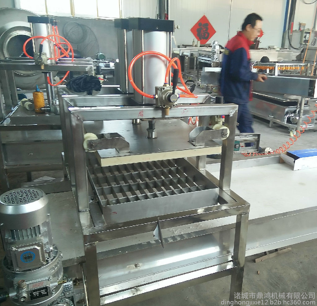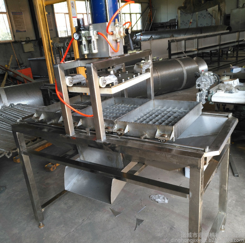 切割设备为我公司生产的专业千页豆腐成套设备之一。可以切割千页豆腐,鱼豆腐,QQ豆干,豆泡,千张,山楂糕及相关特性的物料;还可以切割丁,条,片,块,菱形,三角形等多样化 豆腐切块机,横纵多拍刀具,保证切割效率,切割出的产品尺寸为25*25mm。加入链条传动,切出的成品由网带输送到工作台或料框里。方便省时,节省人工。无废料。欢迎新老客户咨询采购。